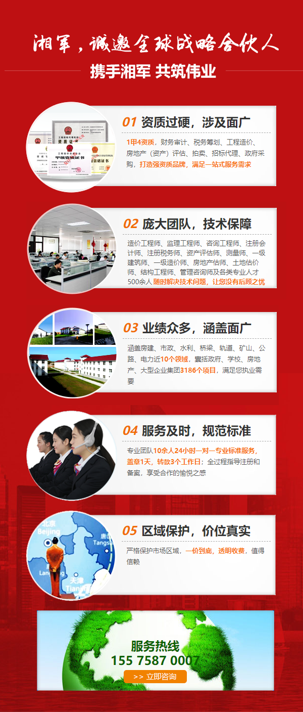 湖南湘軍咨詢集團(tuán)有限公司創(chuàng)立于2008年,是湖南省目前最大的審計、評估、工程、經(jīng)濟(jì)類綜合服務(wù)機(jī)構(gòu)之一,形成了配套完善的工程項目服務(wù)、金融服務(wù)和財稅服務(wù)三大產(chǎn)品體系,具備項目決策、建設(shè)、運營、融資、管理咨詢、資本運作等一條龍服務(wù)功能。工程造價咨詢與工程監(jiān)理等項目管理能力得到了各級政府的充分肯定,報表審計與房地產(chǎn)評估等金融服務(wù)產(chǎn)品在省內(nèi)各金融機(jī)構(gòu)通用,受到廣泛認(rèn)同與支持。本集團(tuán)為個人、企業(yè)、科技產(chǎn)業(yè)園、政府機(jī)構(gòu)提供KPO(知識流程外包):驗資、審計、評估、工程造價、法律、融投資服務(wù);BPO(業(yè)務(wù)流...